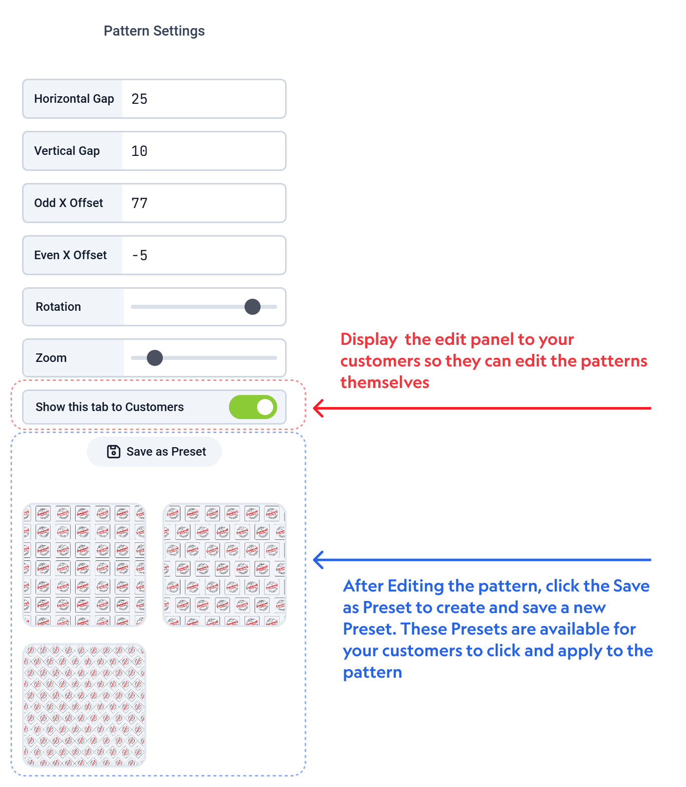 - After modifying the Pattern, you can create a Preset from the patten by clicking the Save as Preset button. This will save the current Pattern settings and display it as a short cut for your customers to apply them when personalizing the design.